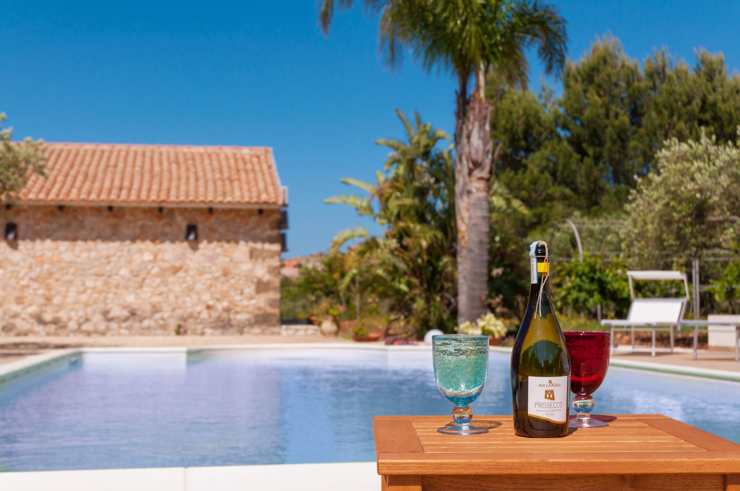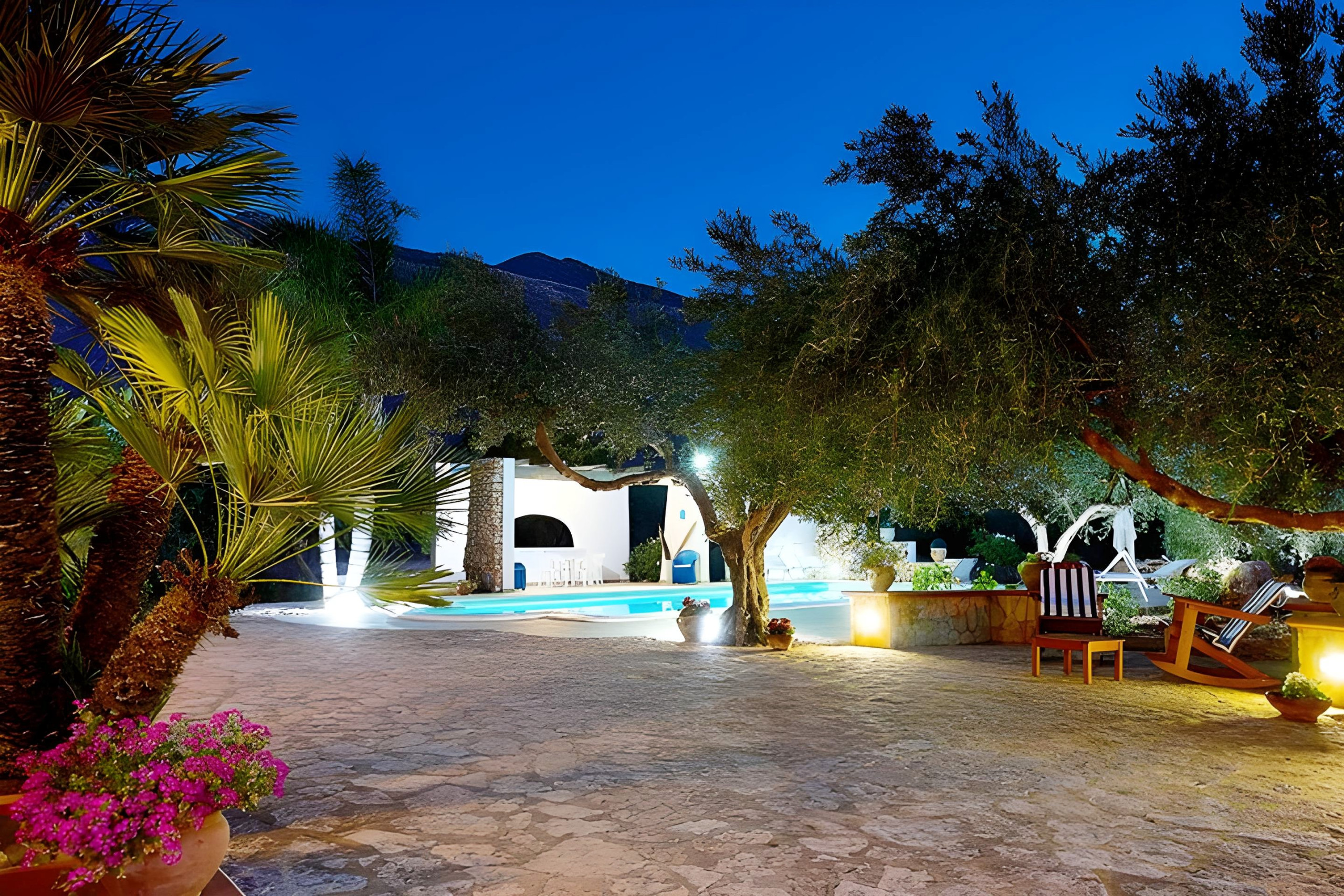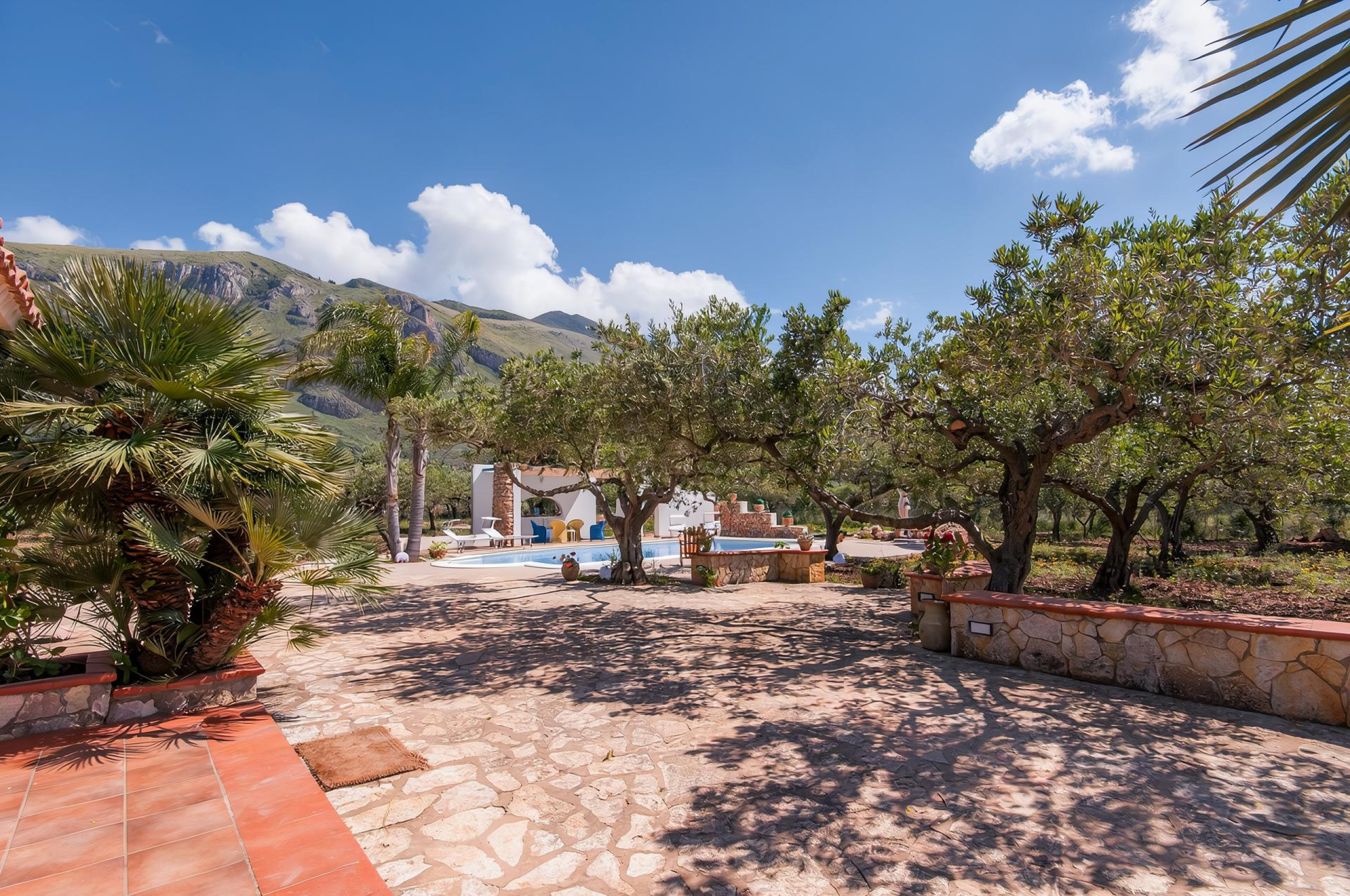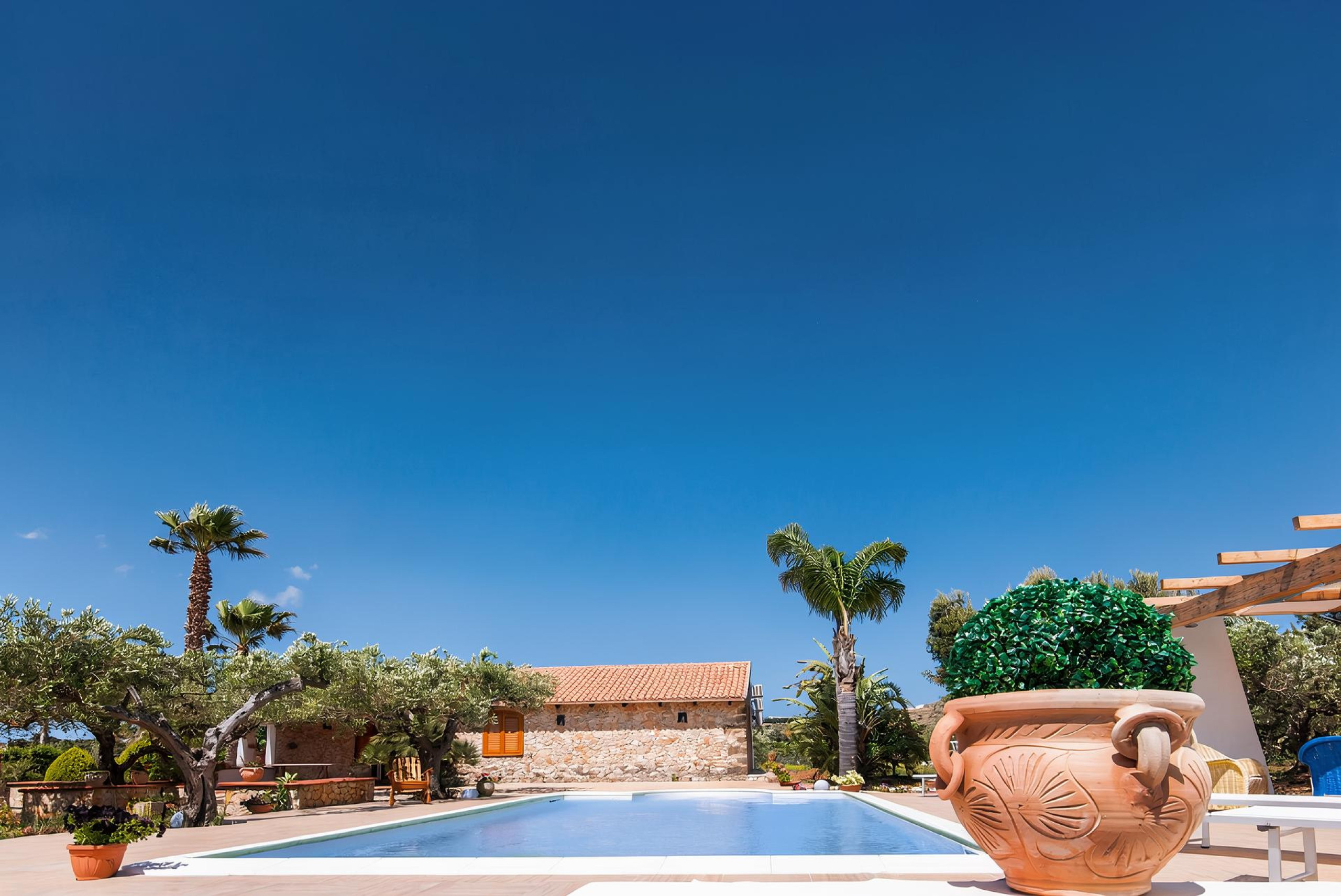 Entourée d'un jardin méditerranéen luxuriant avec des palmiers et des oliviers séculaires, la villa offre une magnifique piscine privée avec une zone solarium équipée, parfaite pour se détendre sous le chaud soleil sicilien ou pour des soirées agréables sous le ciel étoilé.